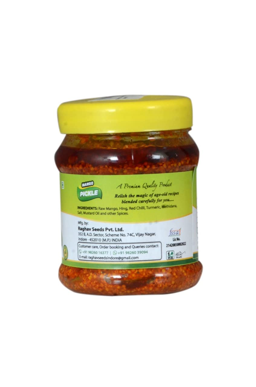 Raw Mango, Hing, Red Chilli, Turmeric, Methi dana, Salt, Mustard Oil and other Spices.